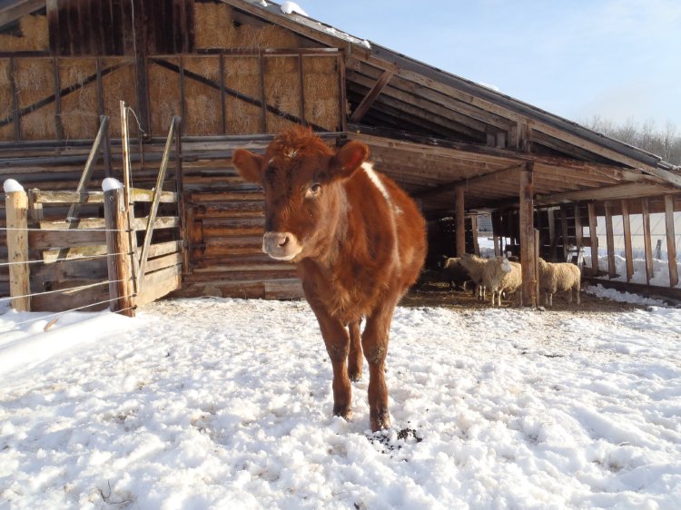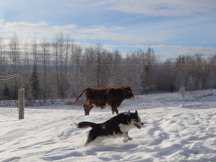 The animals don’t venture too far from their hay racks at this time of year, except for when Mia antagonizes the lambs or calf into a bit of frolicking.